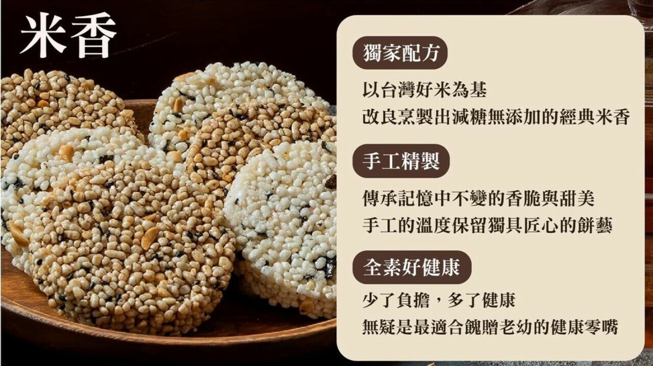 傳承老師傅製餅手藝,嚴選黑糖及西螺優質米,搭配北港花生以及黑芝麻粒,採用創新方法製作,不但保留古早味稻禾香氣,酥脆不黏牙越嚼越香,小小一個充滿新婚滿滿的幸福甜蜜。